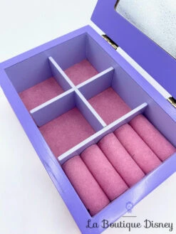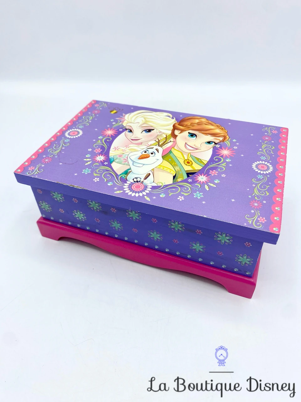 Boite à bijoux en bois violet en forme de petit coffre. Sur le dessus, il y a les portraits des deux soeurs Anna et Elsa ainsi que du bonhomme de neige Olaf. Il y a des arabesques, des fleurs roses et une petite abeille. À l’intérieur de la boite, il y a un miroir et des rangements en feutrine rose pour y mettre toutes vos petites affaires et vos bijoux !