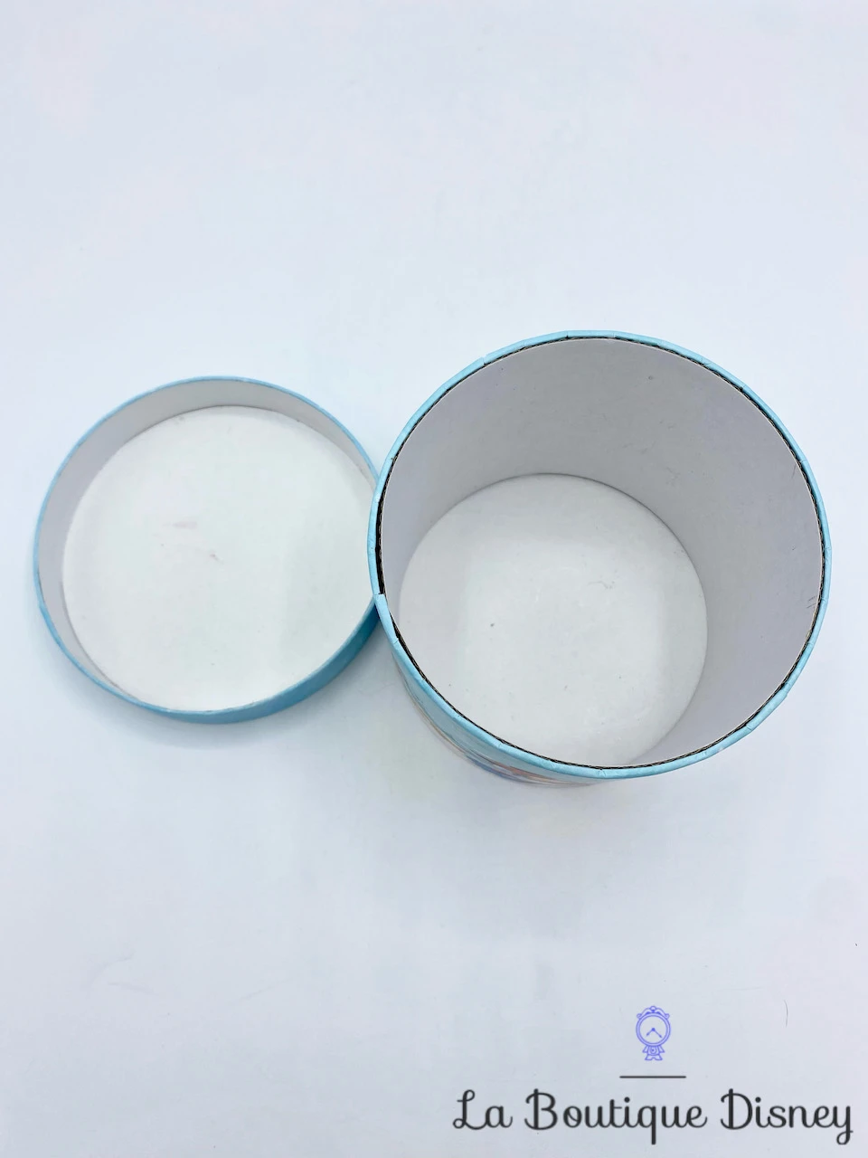 Boite en carton épais ronde de couleur blanche et bleue avec la représentation de Mickey et Minnie et leurs amis à la neige ! Mickey et Minnie, vêtus de leurs tenues d’hiver sont en train de patiner sur la glace. À côté d’eux, se trouve Pluto, Daisy, Donald dans un bloc de glace et Dingo une canne à pêche à la main. Il y a des flocons de neige qui tombent. Sur le couvercle, inscription « Make a Wish » en bleu. Le carton de la boite est très épais et en très bon état.