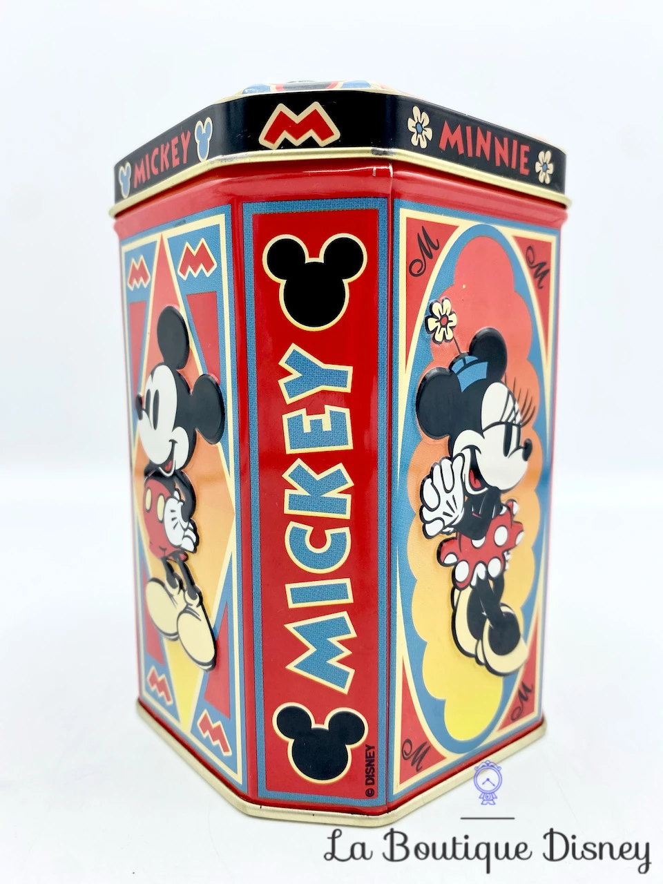 Boite en métal avec différentes représentations de Mickey et Minnie dans des styles rétro vintage. Il y a les inscriptions « Mickey » et « Minnie » en rouge ou bleu à la verticale. Il y a des petites têtes de Mickey noires un peu partout. Forme de boite originale. Sur le couvercle, Mickey et Minnie se tiennent les mains avec un petit coeur rouge.