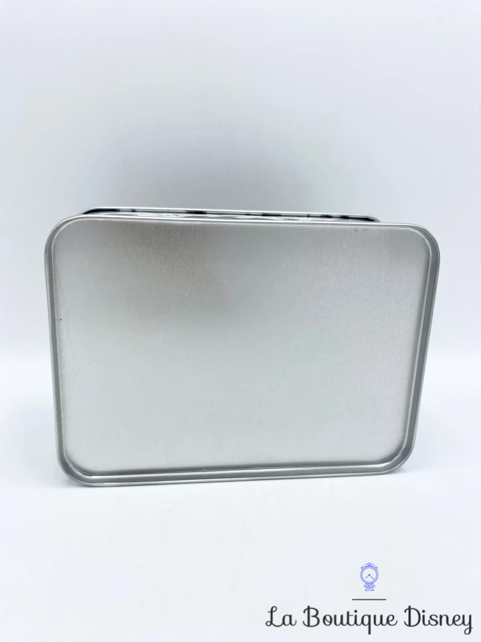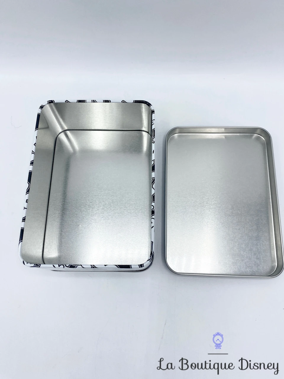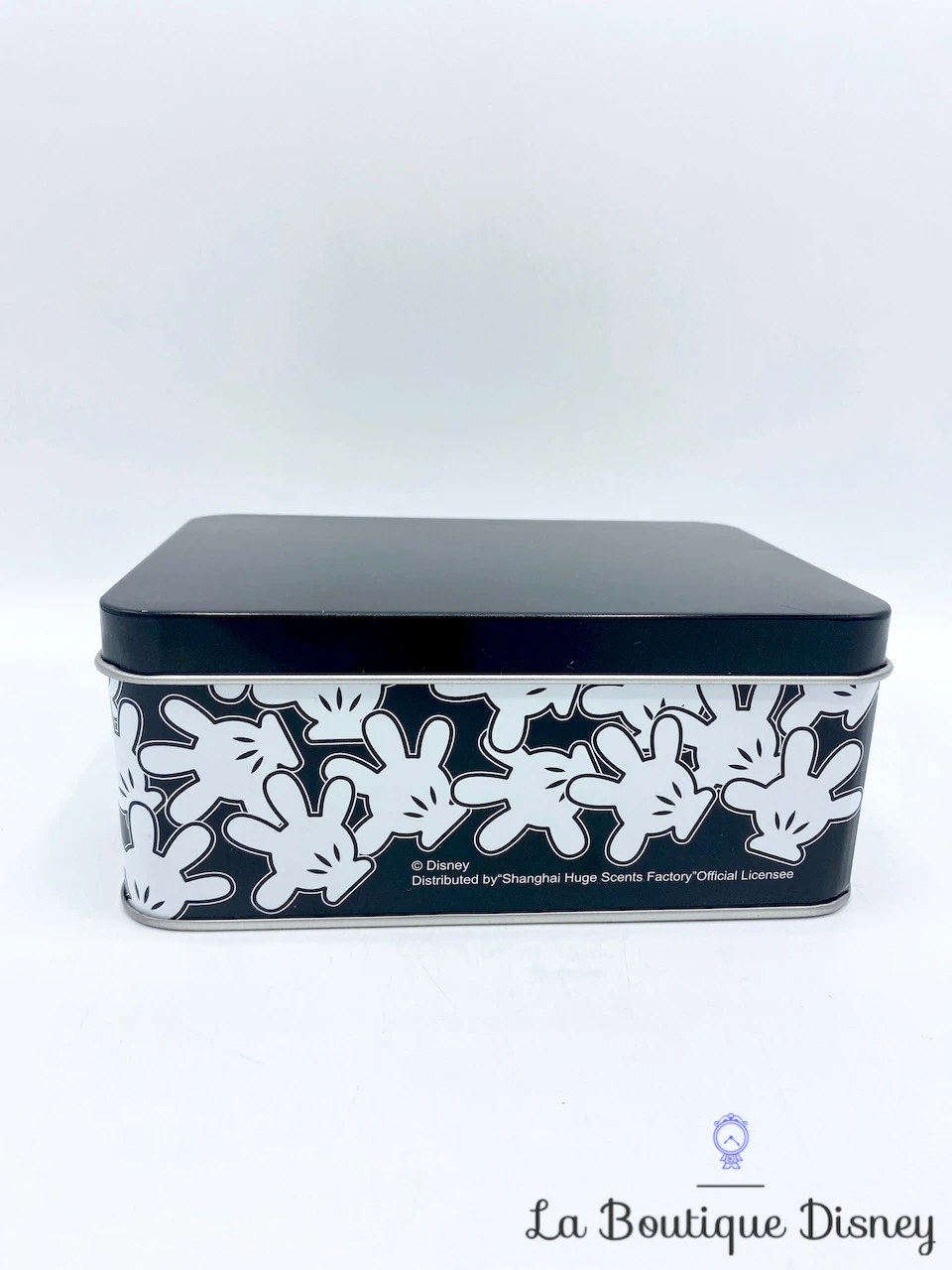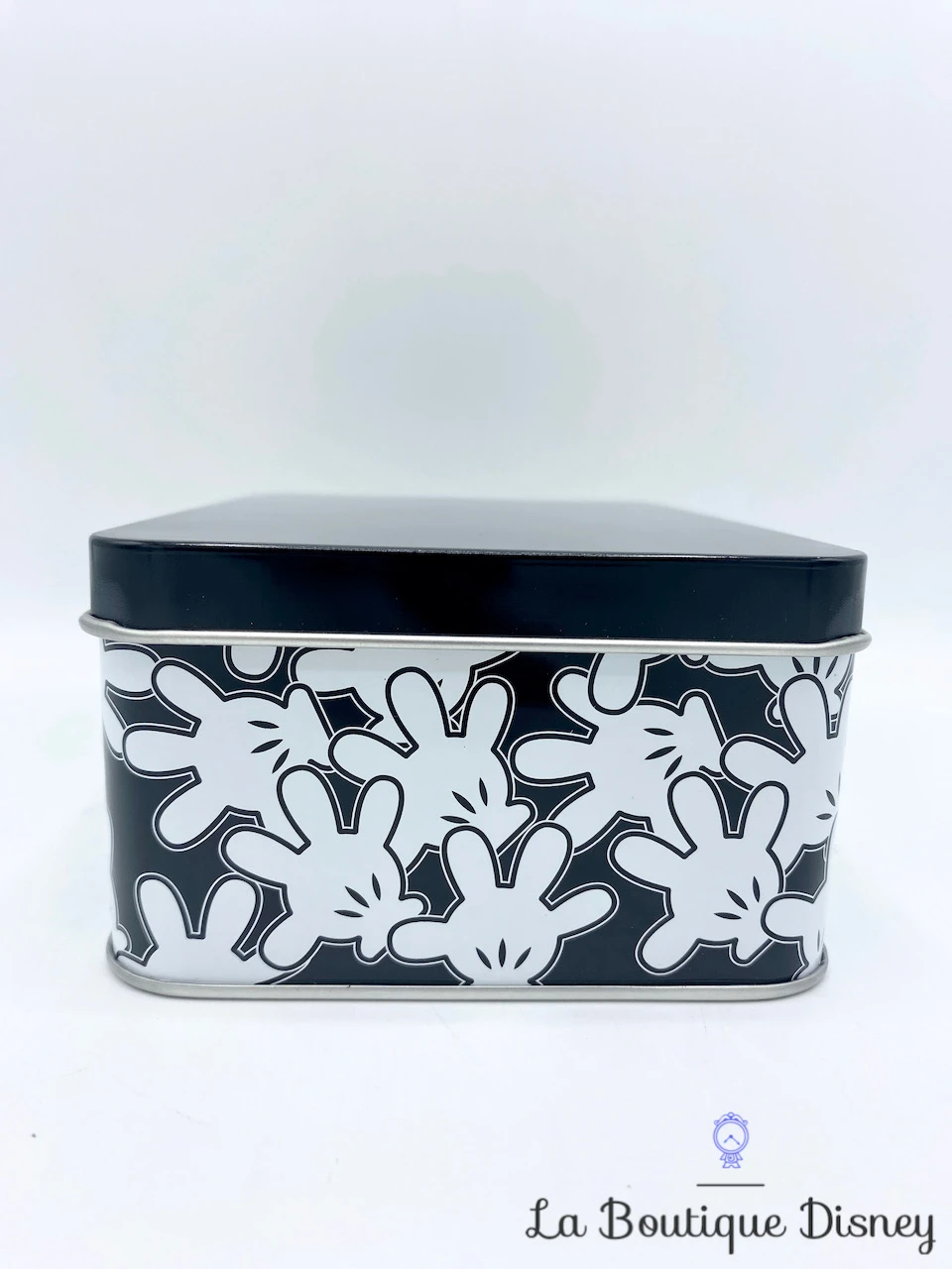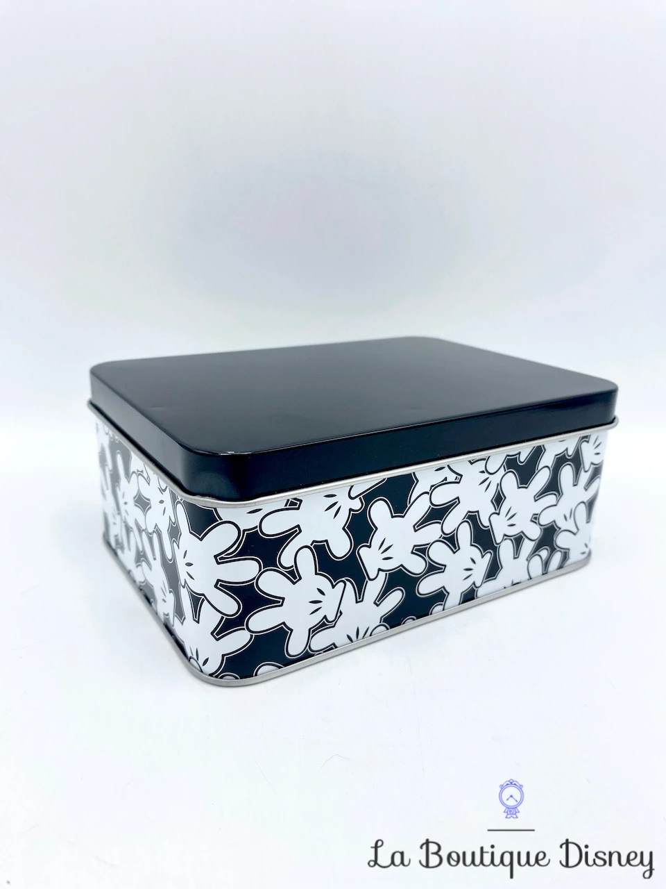 Boite en métal rectangulaire. Le convercle est uni noir. Sur les contours et sur un fond noir aussi est representé une multitude de fois la main de Mickey Mouse recouverte de son gant blanc. Intérieur argenté. Idéale pour y stocker vos petites affaires mais aussi des gâteaux et biscuits !