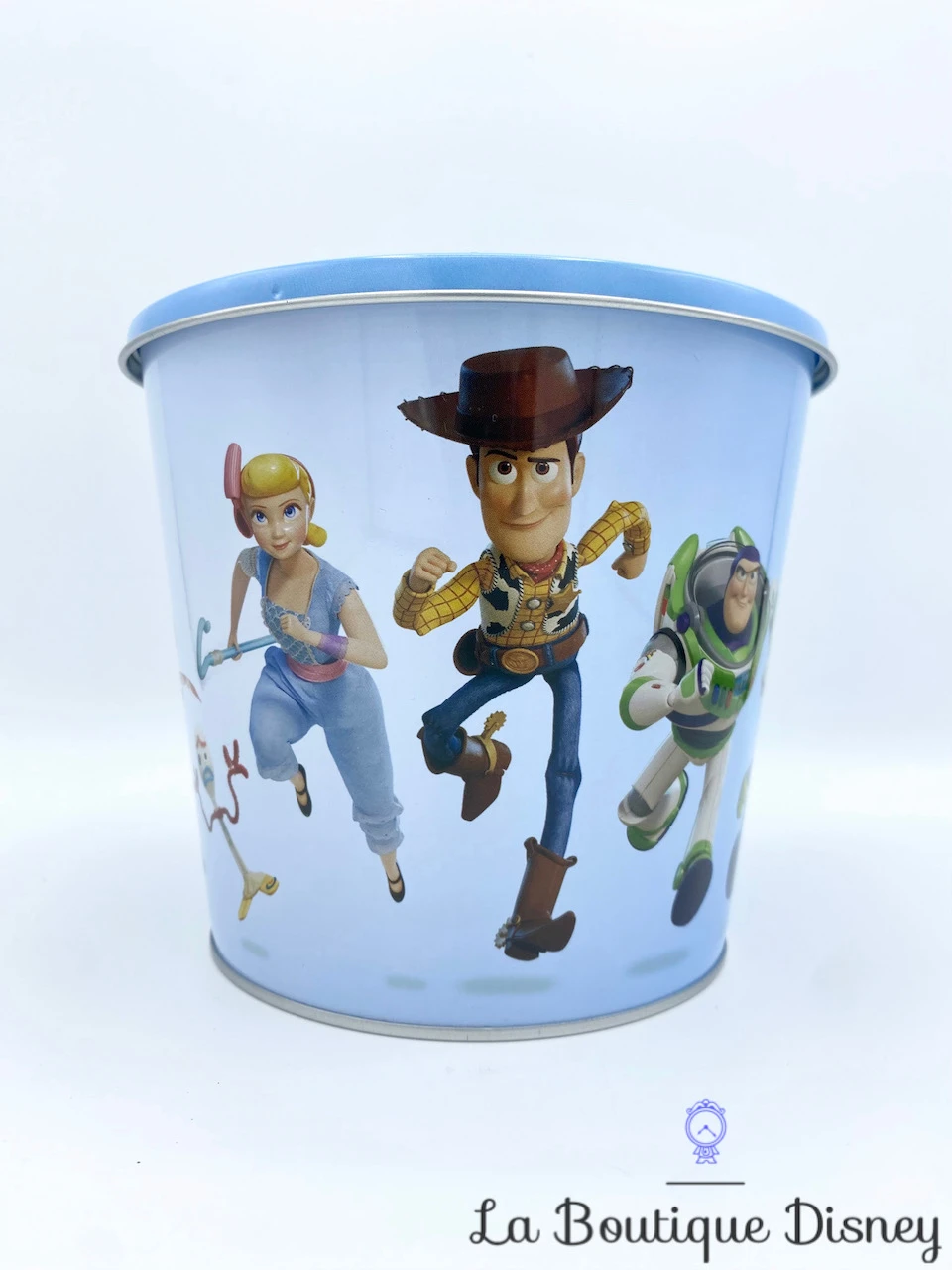 Boite en métal bleu clair ronde. Sur le couvercle et sur une face de la boîte est inscrit « Toy Story 4 Only in Cinemas » avec la typographie du film. Tout autour de la boîte, vous retrouvez vos personnages préférés en train de courir : Woody le cow-boy, Buzz l’éclair le robot intergalactique, un Alien vert, La Bergère, Fourchette et Duke Caboom. Idéale pour ranger jouets ou gâteaux !