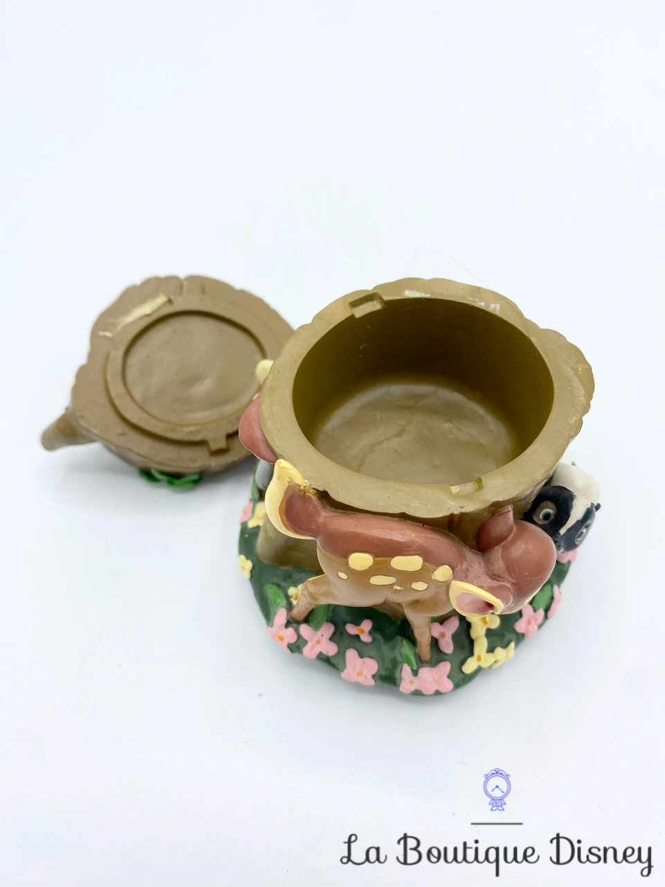 Boite en résine petit format, style « boite à dent » sur le thème du dessin animé Bambi. La boite représente un tronc d’arbre marron. Devant le tronc, se trouvent les deux personnages de Bambi et Fleur la moufette. À l’arrière se trouve Panpan le petit lapin gris en train de rire. Le dessus de l’arbre avec les oiseaux s’ouvre et forme le couvercle de la boite.