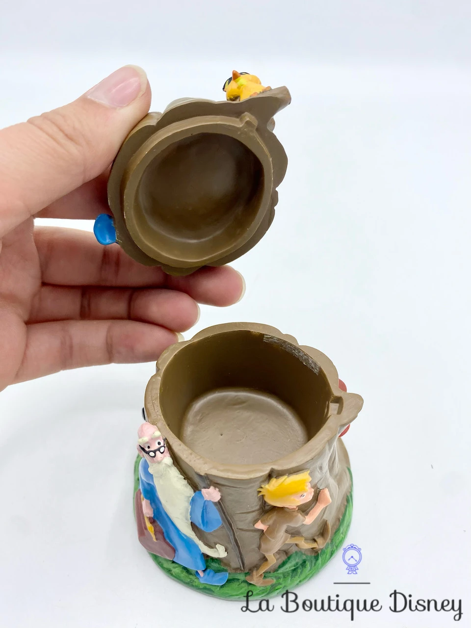 Boite en résine petit format, style « boite à dent » sur le thème du dessin animé Merlin l’enchanteur. La boite représente un tronc d’arbre marron. Devant le tronc, se trouvent les deux personnages de Merlin marchant avec une valise à la main et de Arthur le jeune garçon. À l’arrière se trouve le loup. Le dessus de l’arbre avec le hibou Archimède s’ouvre et forme le couvercle de la boite.