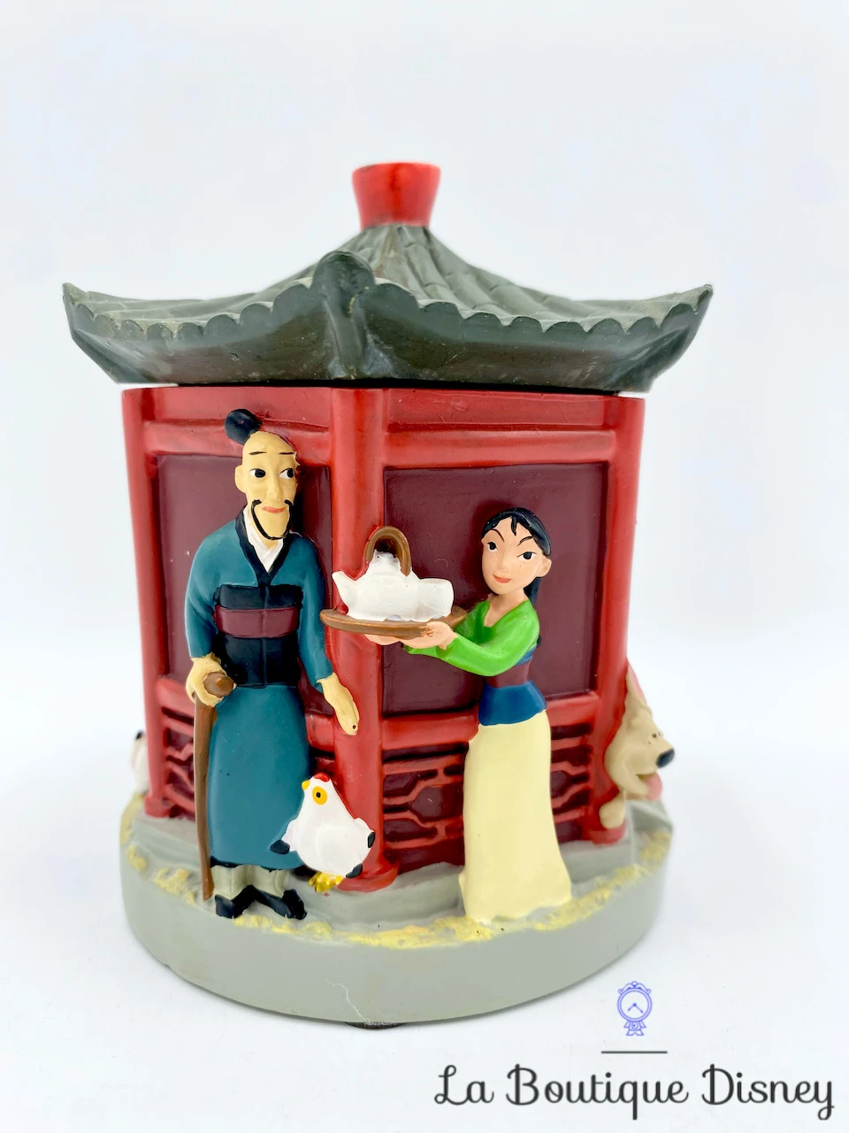 Boite en résine petit format, style « boite à dent » sur le thème du dessin animé Mulan. La boite représente un temple rouge. Devant le temple, se trouvent les deux personnages de Mulan tenant un plateau avec du thé et son père Fa Zhou. À l’arrière se trouvent Petit Frère le chien de Mulan ainsi que des poules. Le dessus du temple s’ouvre et forme le couvercle de la boite.