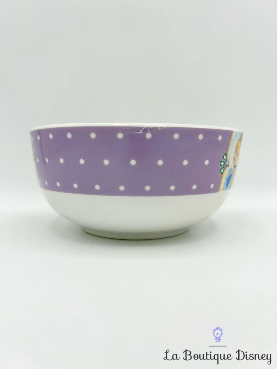 Bol en céramique blanc et violet représentant le portrait de trois de vos princesses préférées : Raiponce, Aurore et Cendrillon. Elles ont de magnifiques couronnes. Fond du bol violet à pois. Intérieur blanc.