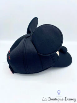 Casquette noire en tissu épais rembourré avec sur le devant le visage de Mickey Mouse. Il y a les deux oreilles et le nez de Mickey en relief. Taille réglable à l’arrière par un scratch rouge sur lequel est inscrit « Disney On Ice ».