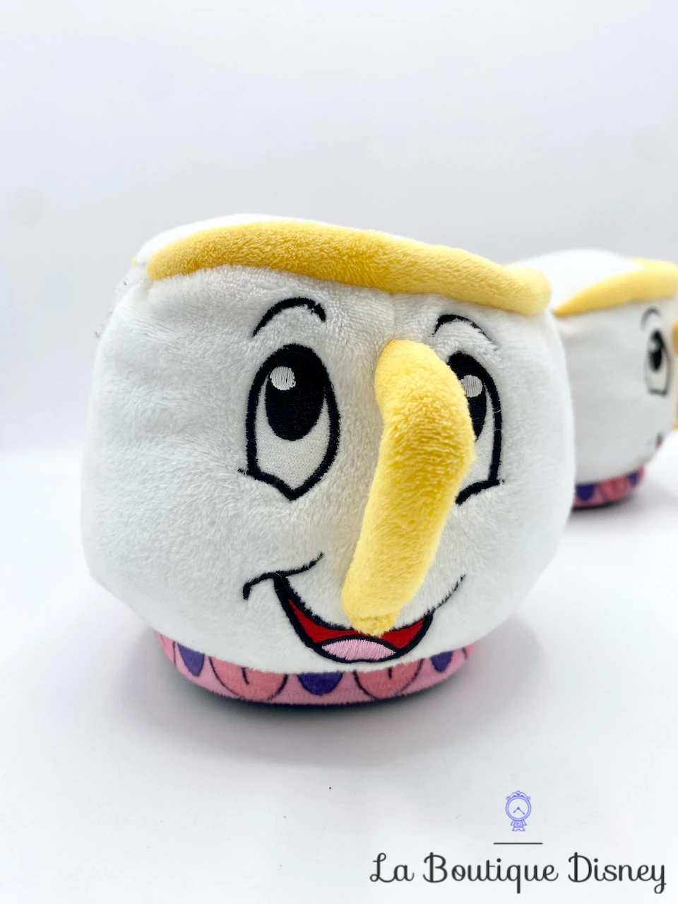 Pantoufles blanches en forme de la petite tasse Zip. Le visage est brodé et il a son nez en forme de anse jaune sur le devant. Arrière des chaussons rose. Semelles antidérapentes.