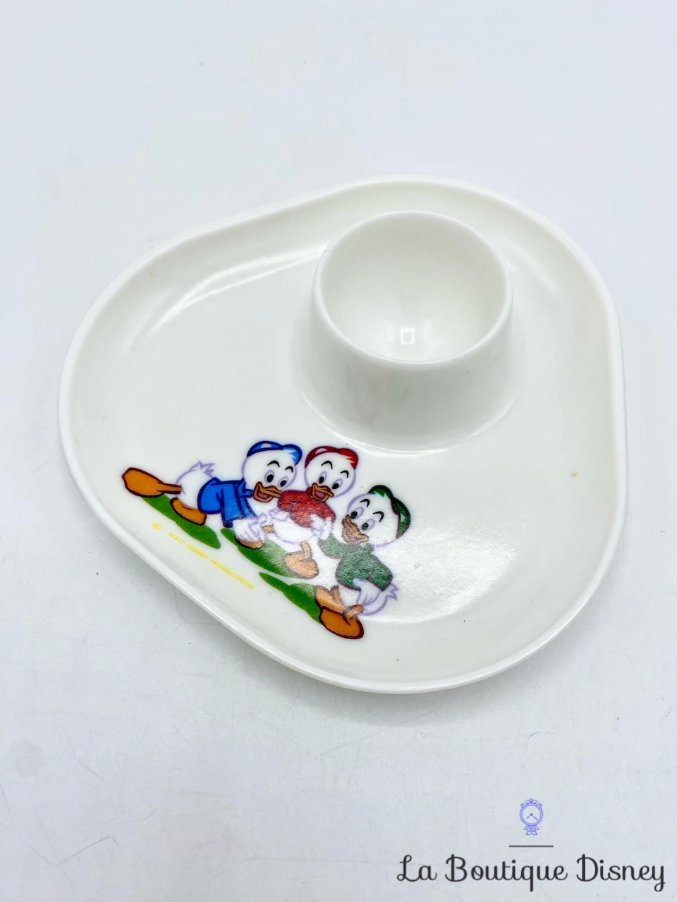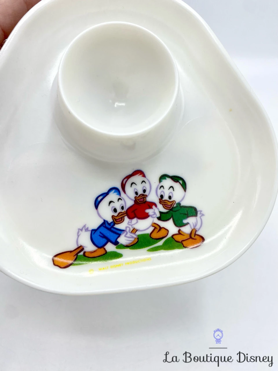 Coquetier en mélamine blanc avec la représentation de Riri, Fifi et Loulou, les petits canards neveux de Donald. Riri est vêtu en rouge, Fifi est habillé en bleu et enfin Loulou en vert. Au centre se trouve l’emplacement pour positionner l’œuf. Petite inscription en jaune « The Walt Disney Productions ».