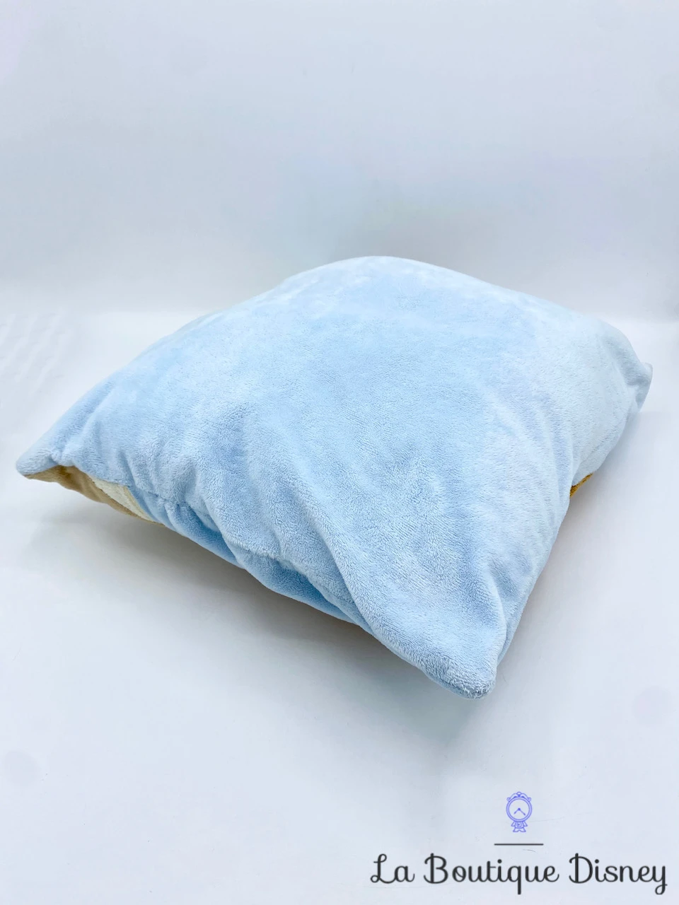 Coussin bleu clair en polyester sur le thème de Blanche Neige et les sept nains. Simplet, le nain muet est couché dans son lit avec son bonnet violet. Il y a une poche sur le coussin dans laquelle vous trouverez une petite peluche de son petit ours marron reliée par un fil noir. Coussin moelleux et confortable.