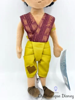 Peluche de Boun, un jeune garçon de 10 ans, propriétaire de son bateau-restaurant : le palais de la crevette. Il a des cheveux noirs ébourriffés, des yeux marron brodés et une tenue asiatique bordeau et jaune / vert clair.
