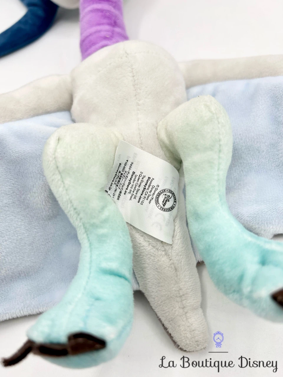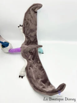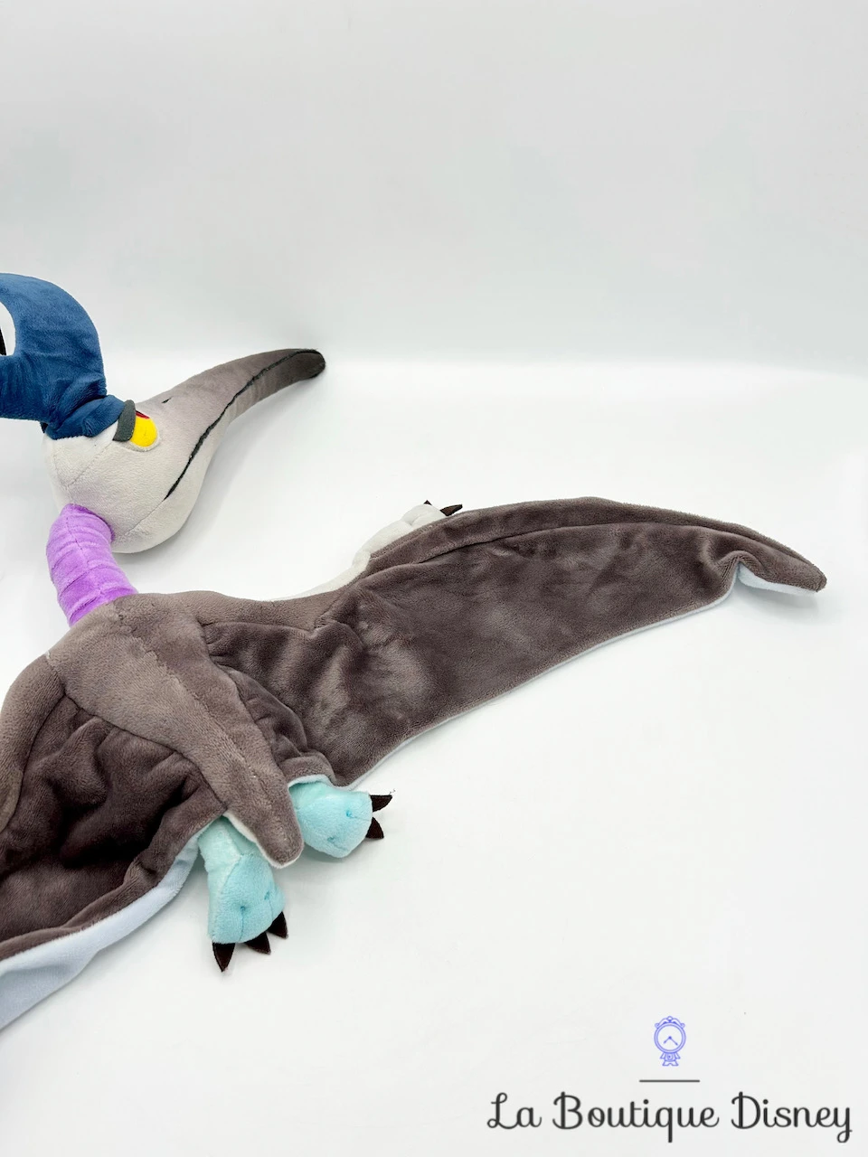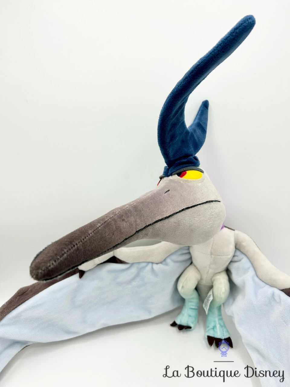 Peluche de Coup de Tonnerre (ou Thunderclap en version originale), le principal méchant du dessin animé Le voyage d’Arlo ! « Il est le meneur d’une bande de ptérodactyles rendus totalement fous par la tempête et qui se repassent des victimes que celle-ci laisse derrière elle. Particulièrement dément et machiavélique, ce nyctosaurus a la crête très proéminente est prêt à toutes les vilénies pour satisfaire son féroce appétit. » C’est un dinosaure avec de grandes ailes marron et bleues, une crête bleue foncée et un coup violet. Il a des yeux jaunes et rouges et un long bec. Écusson officiel Disney Store Original Authentic sur une aile de la peluche.