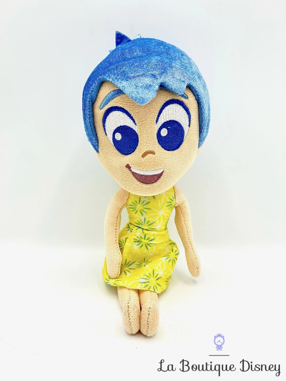 Peluche brodée de Joie, l’une des émotions de Riley dans le dessin animé Vice Versa. Elle porte sa tenue classique avec une robe verte graphique. Elle a des cheveux bleus pailletés. Son visage est jaune et brodé avec des grands yeux bleus. Peluche très douce !