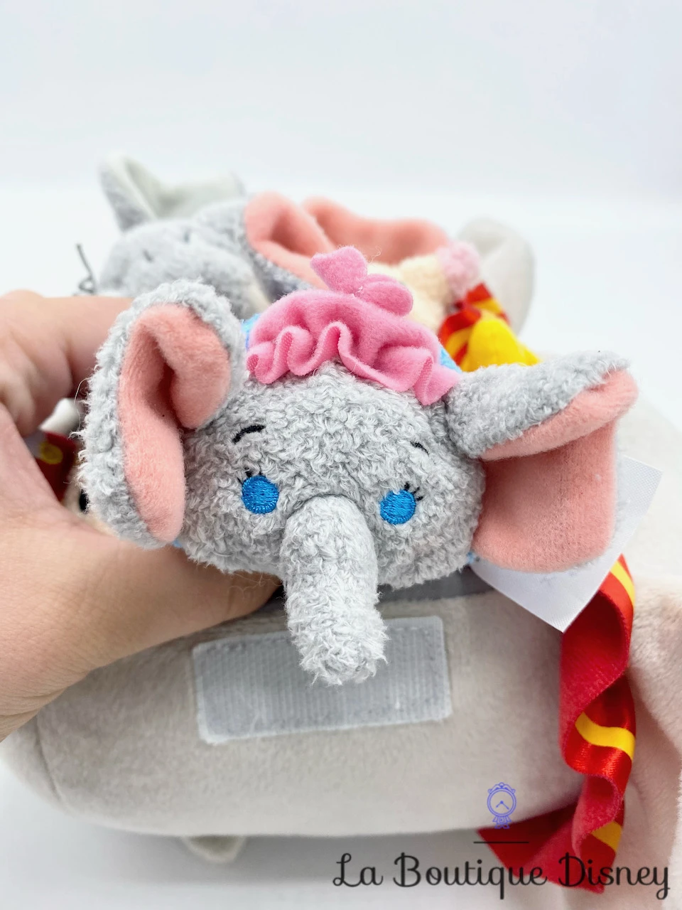 Cette peluche tsum tsum à l’éffigie du Dumbo, l’éléphant gris connu pour voler grâce à ses grandes oreilles, contient quatre mini Tsum Tsum à savoir Mrs Jumbo, Timothée la petite souris, Dumbo en clown et Baby Dumbo.Les quatre mini tsums peuvent se ranger dans un petit compartiment fermé par un scratch situé sur le dos de l’éléphant. Deux anses permettent de promener vos amis dans leur sac partout avec vous !
