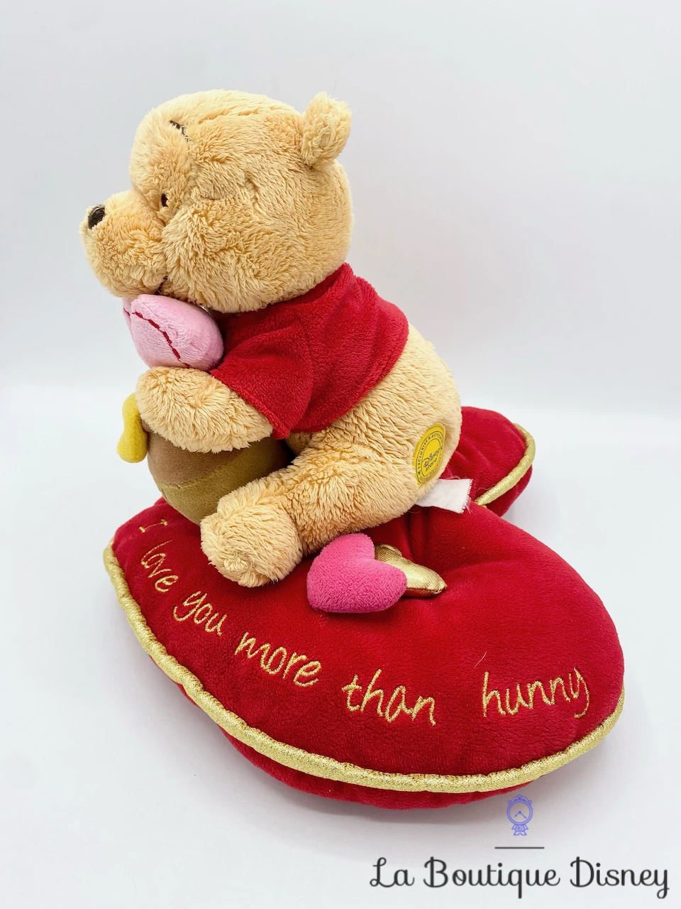 Peluche de Winnie l’ourson le petit ours jaune. Il est habillé avec un tee shirt rouge. Il est assis sur un coussin rouge en forme de coeur rouge. Sur ce coussin est brodée en doré l’inscription « I love you more than hunny ». Il tient dans ses bras un pot de miel ainsi qu’un petit coeur rose. Écusson Disney Store Exclusive & Authentic au dos de la peluche.