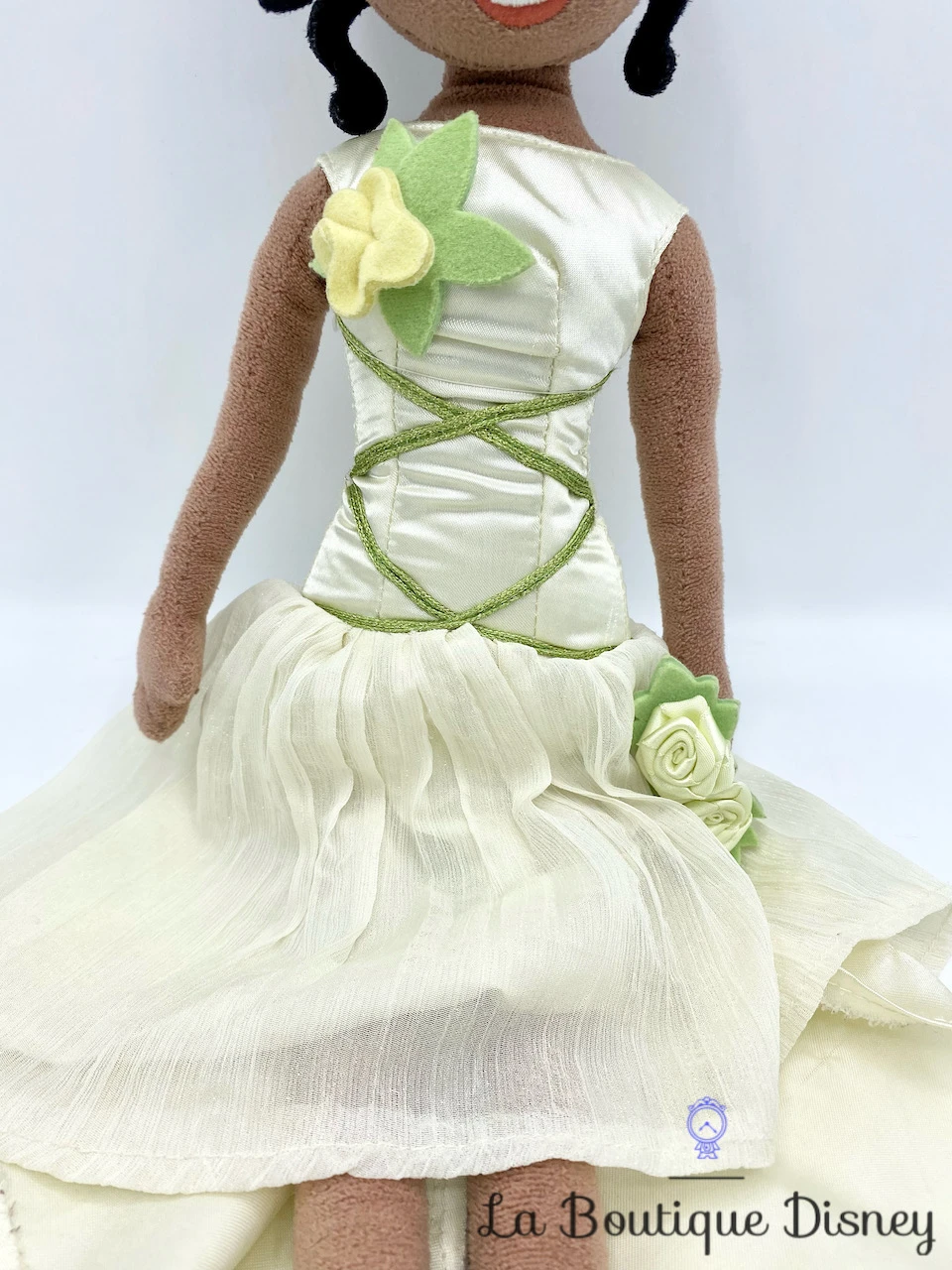 Peluche de la princesse Tiana avec un sublime visage brodé, des yeux marrons et des cheveux noirs surmontés de son diadème en pétales. Elle porte une robe de satin vert très clair asymétrique. Le devant est beaucoup plus court que l’arrière. Tiana est vêtue pour son mariage, avec une fleur en feutrine sur la poitrine et un bouquet de fleurs à la main !