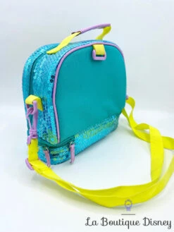 Sac vert à strass sequins avec deux compartiments. Compartiment supérieur avec espace glacière / isotherme et compartiment inférieur avec fermeture éclair classique. Extérieur du sac en tissu vert violet avec portrait sur le devant de la Petite Sirène en train de se coiffer les cheveux avec sa fourchette. Petite anse sur le dessus pour tenir le sac à la main et bandoulière jaune pour le porter à l’épaule (amovible). Idéal pour transporter votre prochain pique nique !