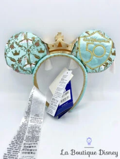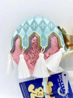 Devenez une véritable star avec ce serre tête de Mickey Mouse et Prince Charming. Collection rendant hommage aux attractions cultes du parc Disneyland et de Walt Disney World dans le cadre des 50 ans du parc « The World’s Most Magical Celebration ». Cette septième pièce de la série (7/12) est sur le thème de l’attraction Regal Carrousel. Ears avec sur une oreille un cheval du carroussel, sur l’autre des petits pompons blancs. Fond rose à sequins et bleu satiné avec des motifs royaux. Au centre, il y a une courronne dorée. Broderie « Walt Disney World 50 » au dos d’une oreille.