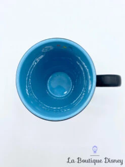 Mug en céramique noir représentant Bourriquet, le petit âne violet / bleu ami de Winnie l’ourson au milieu d’un champ de fleurs. Les fleurs sont toutes différentes, il y a notamment des pissenlits. Elles sont multicolores et le contraste des couleurs des fleurs sur le fond de la tasse noir est très joli. Intérieur de la tasse bleu. Anse noire.