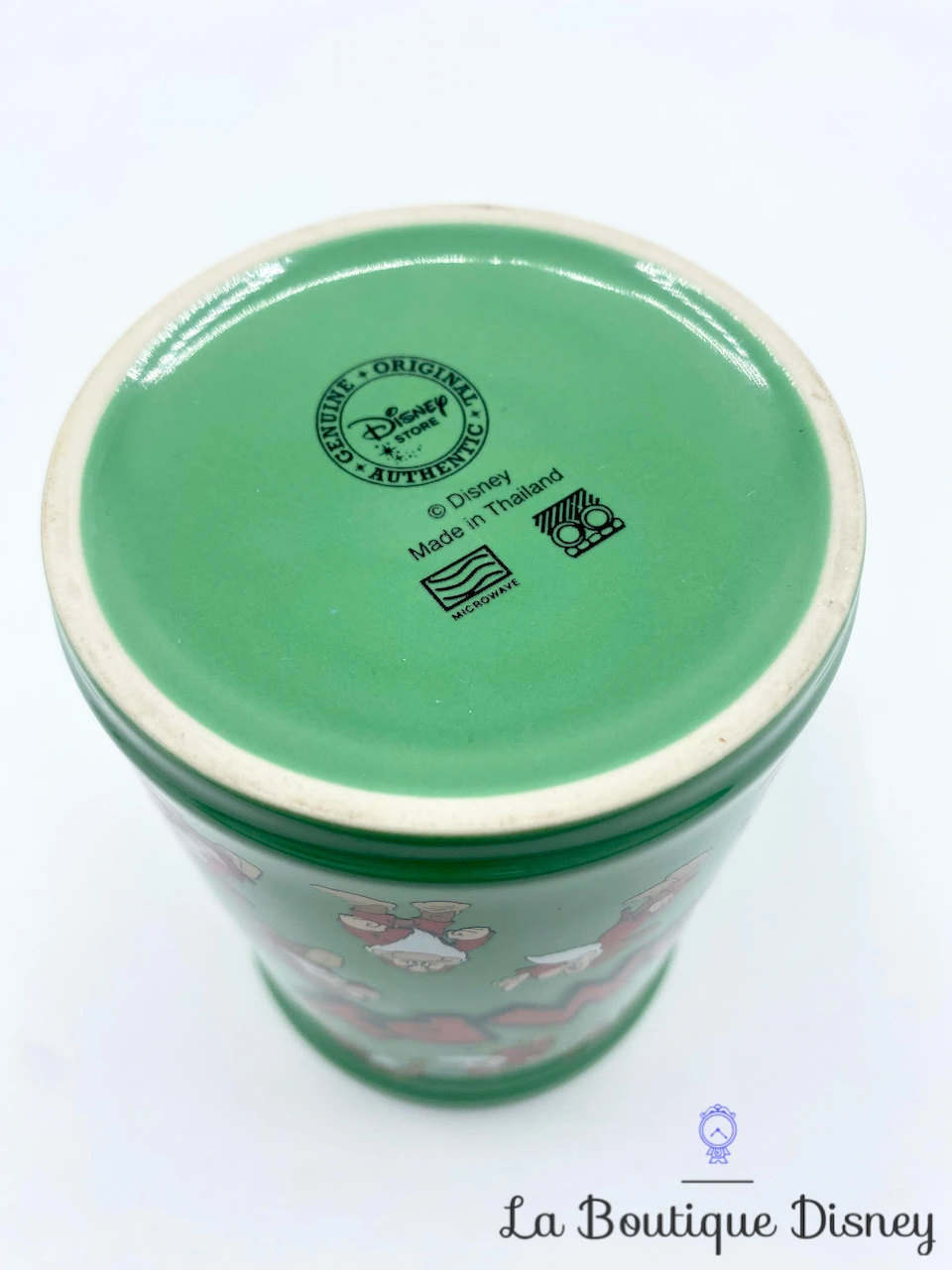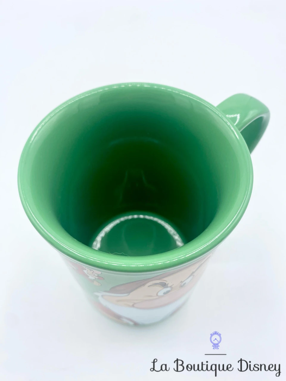 Mug en céramique vert représentant le portrait d’un des sept nains de Blanche Neige, Grincheux. Il porte son chapeau marron et sa chemise rouge. Sur la deuxième face, vous retrouverez l’inscription en rouge « Grumpy ». Tout autour de la tasse, le nain est représenté dans différentes postures et humeurs mais toujours en colère ! Anse et intérieur verts. Tasse grande capacité.