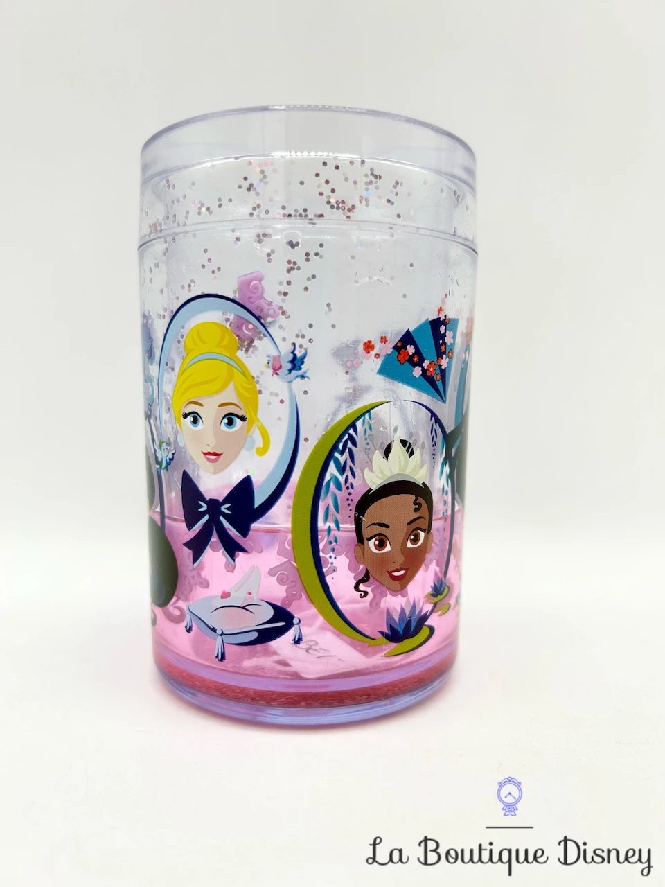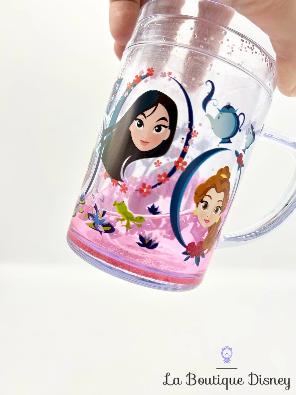 Mug plastique rose et transparent sur le thème des Princesses. Des dessins en fond représentent les visages de différentes princesses : Mulan, Cendrillon, Tiana, Jasmine et Belle. Il y a également des petits motifs avec le prince Naveen en grenouille, Madame Samovar, la pantoufle de verre, un éventail ou encore le Génie de la lampe. La tasse possède une « double paroi » dans laquelle se trouvent de l’eau et des petites paillettes qui se mettent en mouvement quand vous bougez la tasse.