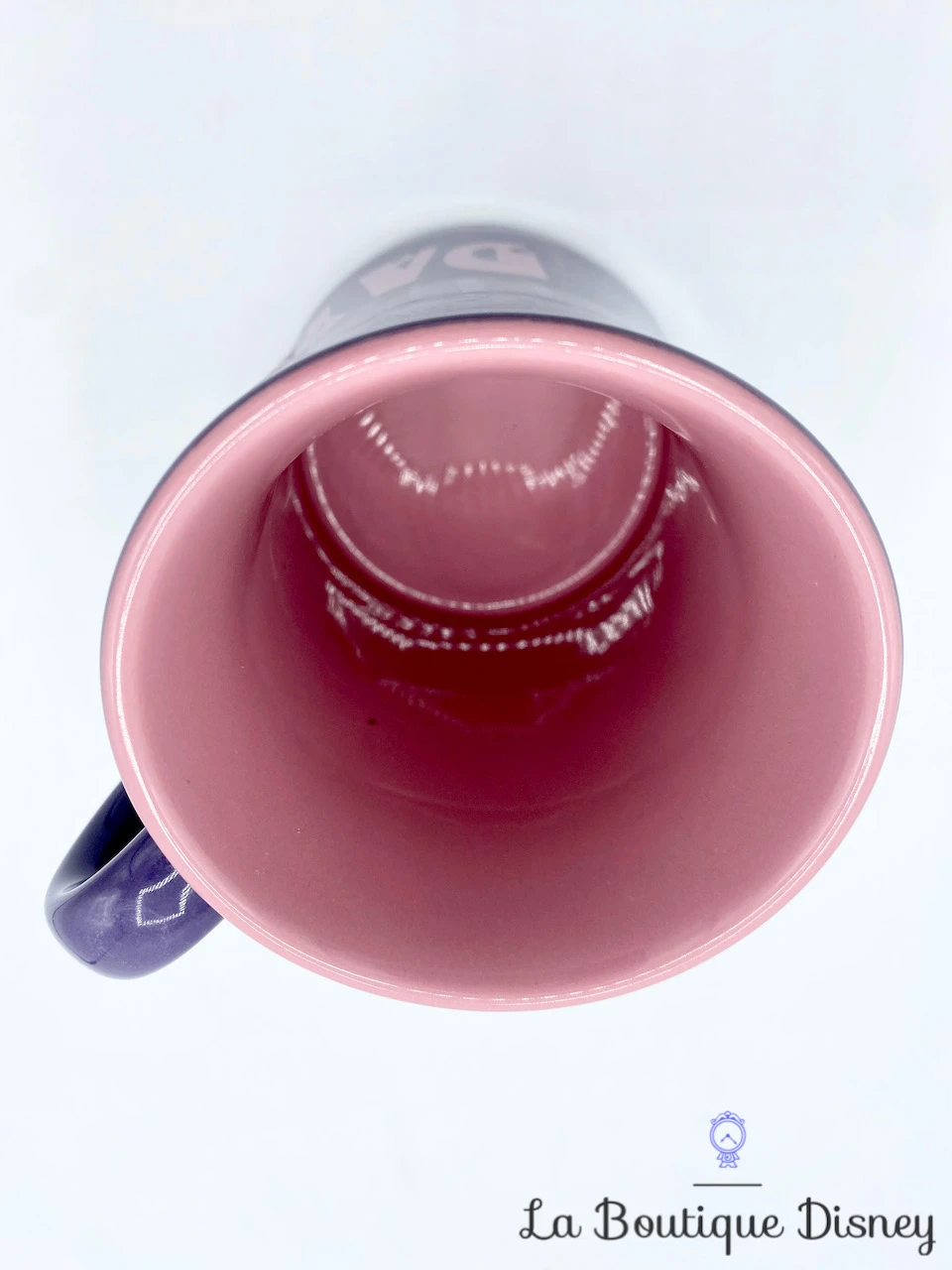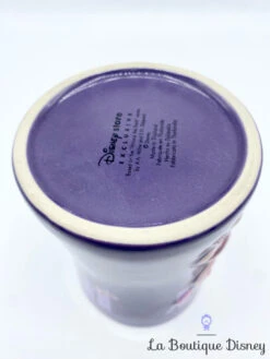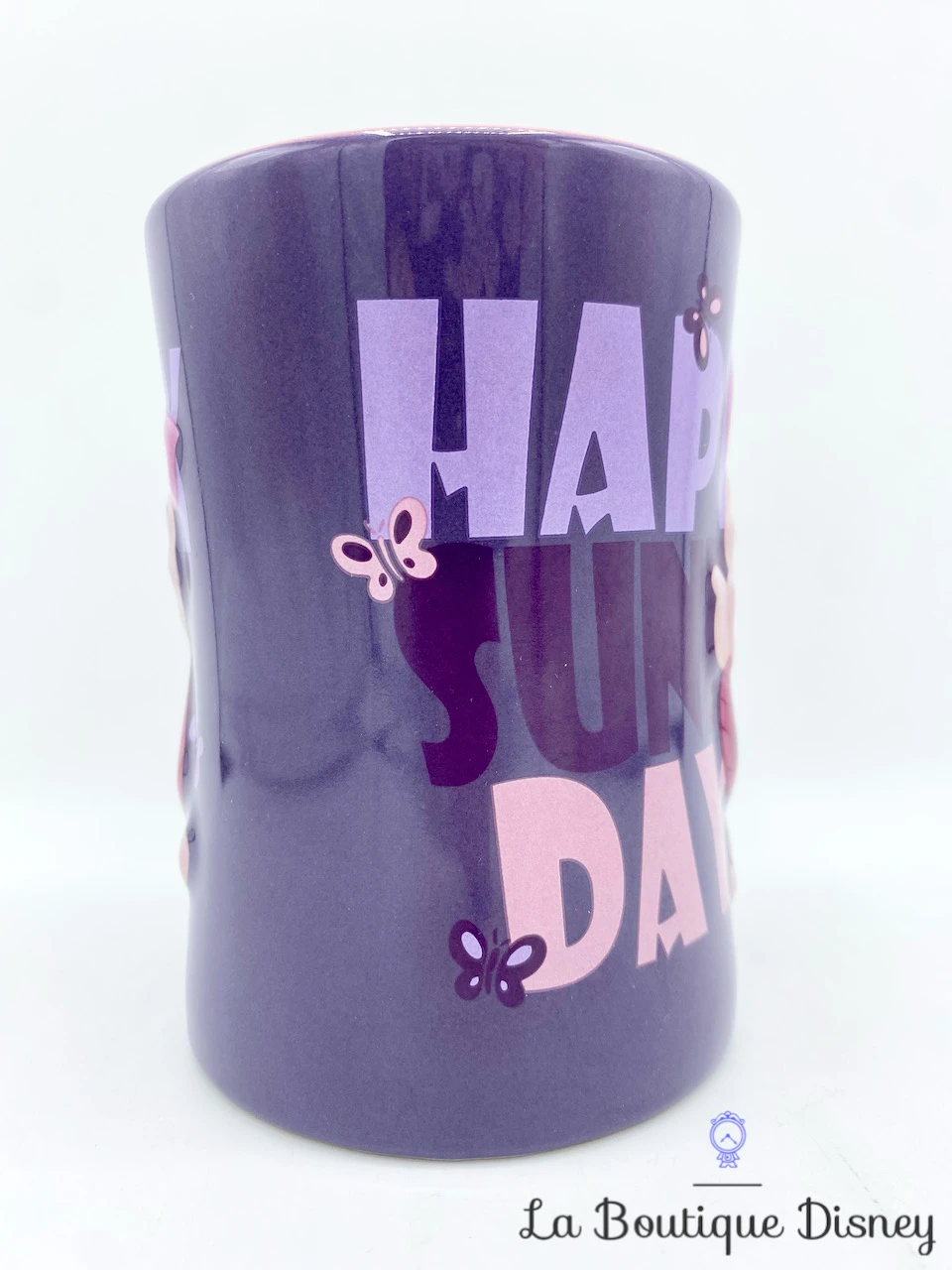 Mug en céramique violet et rose représentant Porcinet, petit cochon ami de Winnie en léger relief 3D. Il est en train de danser en tappant des mains autour de quelques papillons. Derrière lui, se trouve l’inscription en rose « Happy Sunny Day ». Les deux faces du mug sont identiques. Anse de la tasse violette et intérieur rose.