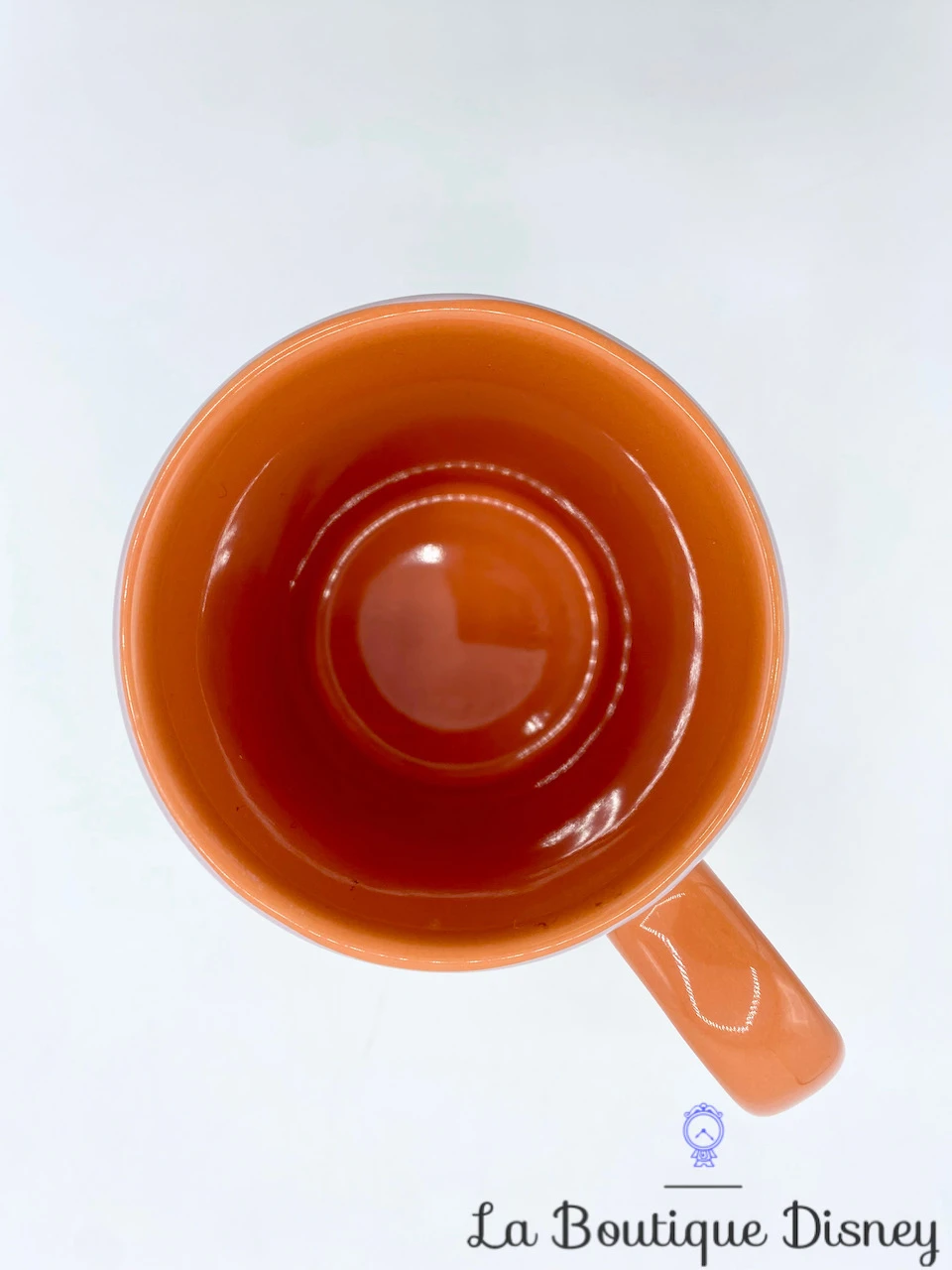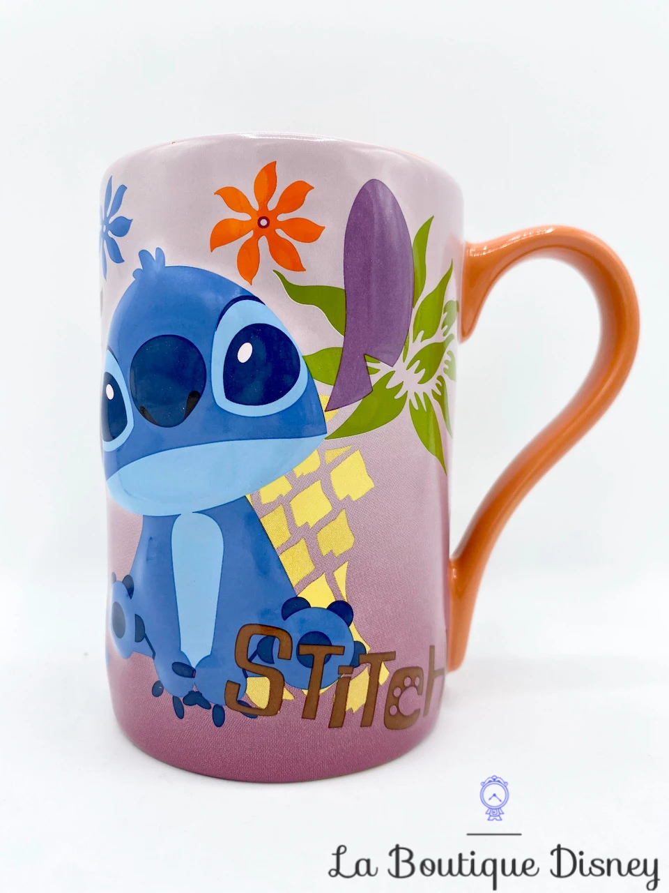 Mug dans les tons de rose et orange avec sur une face la représentation de notre petit monstre bleu favori, Stitch. A côté de lui, se trouve un ananas géant ainsi que des fleurs de différentes couleurs. Sur l’autre face de la tasse, il y a une deuxième représentaion de Stitch, cette fois-ci en plus gros plan. Il est assis et vous regarde d’un air hésitant. L’inscription en marron « Stitch » est présente deux fois sur le bas du mug. La anse est orange comme l’intérieur de la tasse. Léger relief 3D.