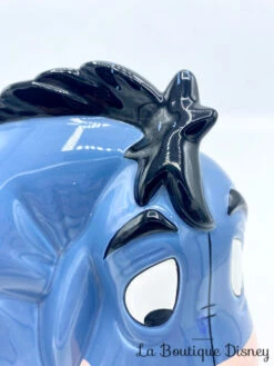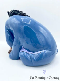 Tirelire en céramique de l’âne bleu, Bourriquet. Il a un noeud violet au bout de la queue. Fente à l’arrière pour insérer la monnaie. Bouchon récupérateur sous la tirelire. Peinture délicat du visage.