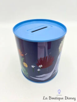 Tirelire en métal cylindrique sur fond bleu représentant Elsa en train de montrer son ami la salamandre Bruni, habitant de la Forêt Enchantée à sa soeur Anna. Elles sont agenouillées toutes les deux face à face. Olaf, le bonhomme de neige, leur inséparable compagnon les regarde l’air amusé et content. Fente sur le dessus pour y insérer la monnaie.