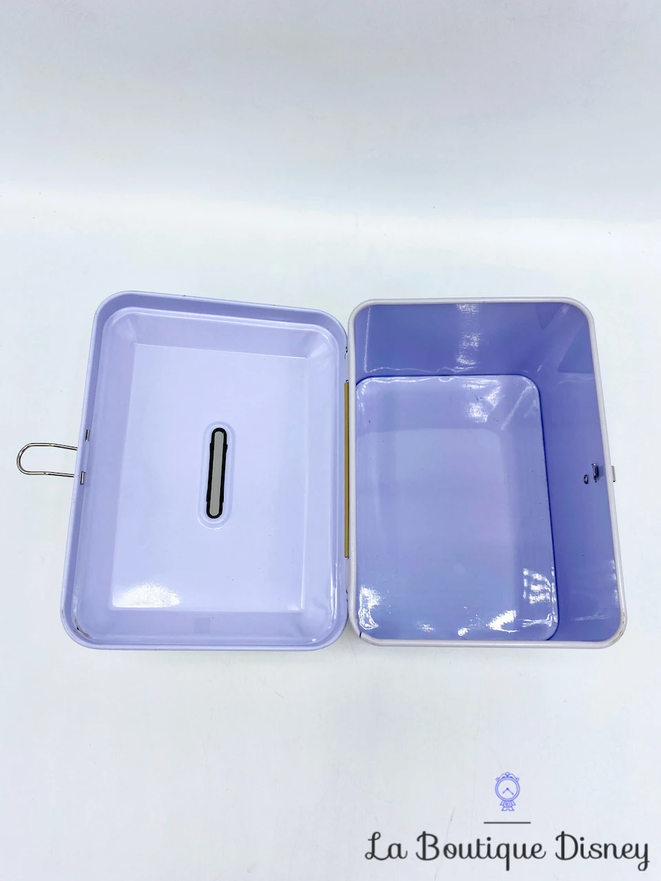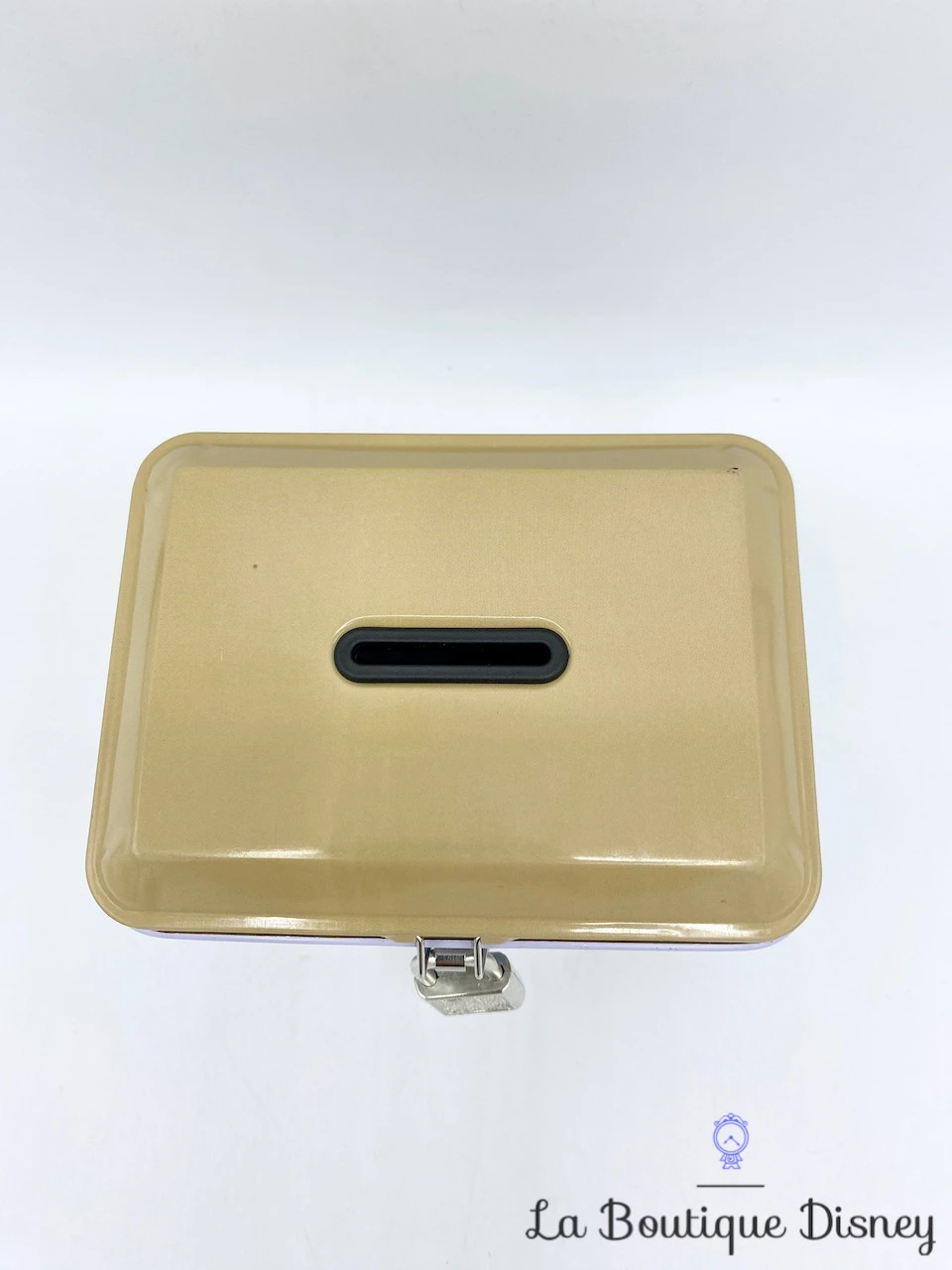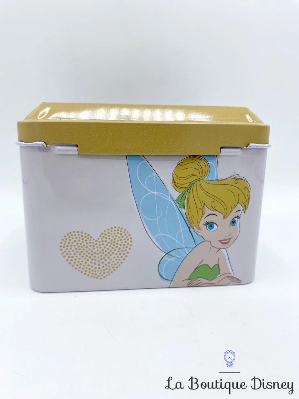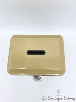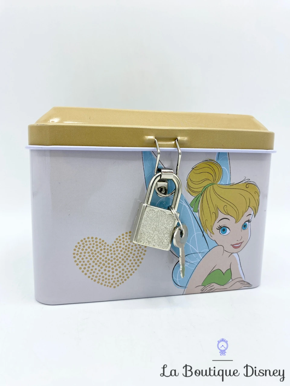 Tirelire en forme de coffret en métal rose clair avec la fée clochette représentée sur la face avant et arrière. Son visage est en premier plan, elle arbore son chignon blond, ses beaux yeux bleus et le bustier vert de sa robe. A sa gauche est dessiné un coeur en pointillés. Sur les deux côtés de la boite, il y a l’inscription « Tinker Bell ». Fente sur le dessus du coffret pour insérer la monnaie. S’ouvre sur le devant grâce à un crochet fermé par un petit cadenas muni de deux clés.