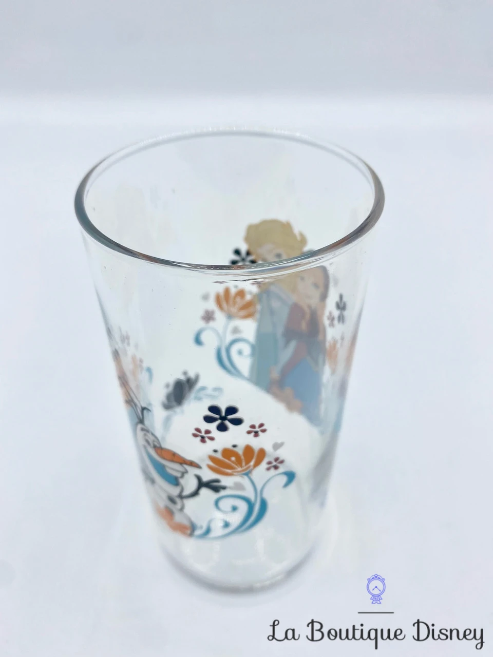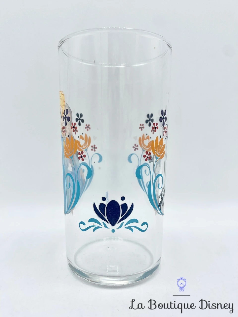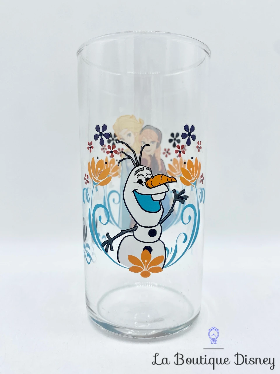 Verre transparent représentant les deux soeurs d’Arendelle, Elsa et Anna. Elsa porte sa robe bleu clair habituelle et se trouve à côté de sa soeur Anna. Avec sa chevelure tressée rousse, elle est très souriante et porte une cape violette. Autour d’elles, se trouvent de nombreuses fleurs orange et violette et leur bonhomme de neige préféré Olaf !
